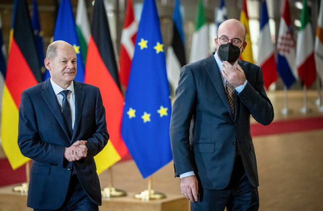 Chancellor Olaf Scholz is welcomed by Charles Michel President of the European Council. 10 December.