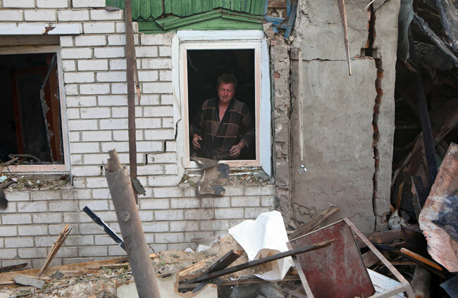 Roman Kravchenko stands inside the ruins of his house, destroyed by the russian shelling from multiple rocket launchers, Kharkiv. ABACA/PA Images