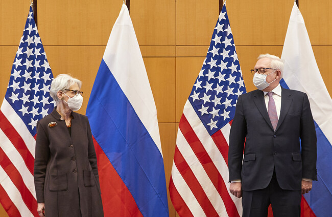 S Deputy Secretary of State Wendy Sherman, left, and Russian deputy foreign minister Sergei Ryabkov attend security talks at the United States Mission in Geneva, Switzerland. DENIS BALIBOUSE