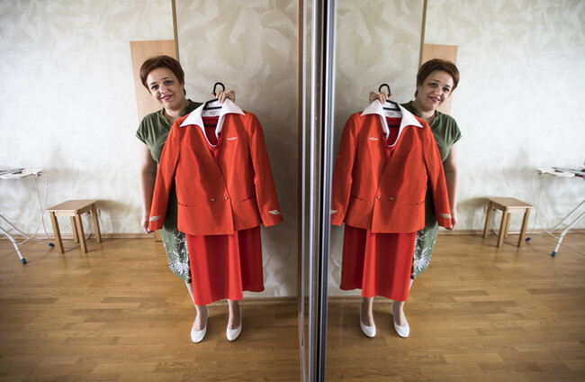 Aeroflot flight attendant Yevgeniya Magurina shows her uniform during an interview with the Associated Press Alexander Zemlianichenko/PA