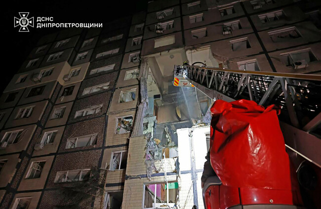 A fire broke out and several apartments were destroyed in the nine-story building in Dnipro, the emergency services said. Rescuers recovered the bodies of three people, including two women, and two children were among the injured.