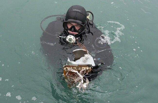 A Russian diver lifts a fragment of the plane from the Black Sea. AP/Press Association Images