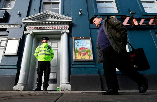 A poice officer stands guard outside a branch of the Italian chain restaurant Zizzi close to The Maltings shopping centre in Salisbury. AFP/Getty Images