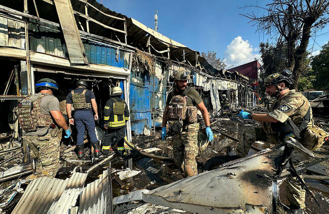 Ukrainian servicemen conduct work on the site of destroyed market as a result of a Russian missile strike. Alamy Stock Photo