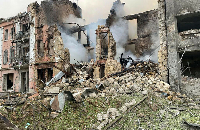 In this photo provided by the National Police of Ukraine, smoke rises from a building destroyed by a Russian attack in Mykolaiv, Ukraine. Alamy Stock Photo