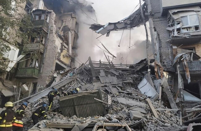 russia-ukraine-war In this photo provided by the Ukrainian Emergency Service, rescuers work at the scene of a building damaged by shelling in Zaporizhzhia. AP / PA Images AP / PA Images / PA Images
