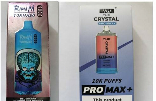 The products are sold under the names R and M Tornado 9000 Disposable Cherry Cranberry and WGA The Crystal Pro Max + 10K Puffs Blueberry Raspberry.