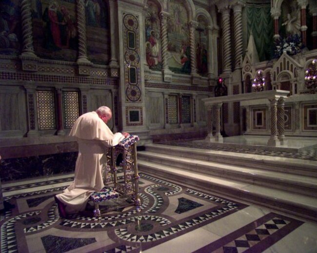 Pope John Paul II prays in the Blessed Sacrament Chapel in Cathedral Basilica on 27 January, 1999. (AP Photo/Amy Sancetta, File)