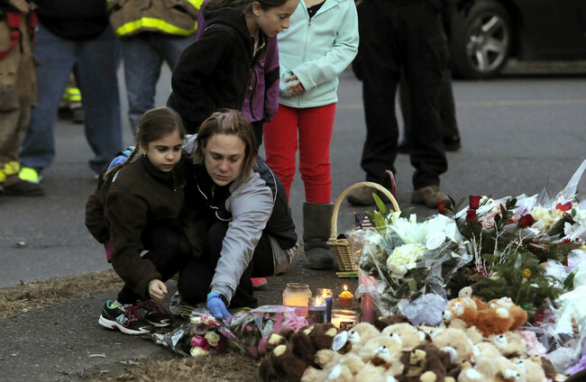 A woman and a little girl leave a bouquet of flowers at a makeshift memorial near Sandy Hook Elementary School in 2012. Hartford Courant
