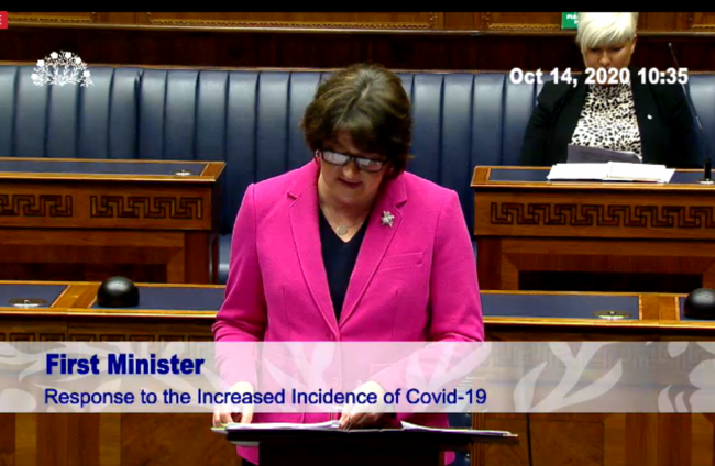 First Minister Arlene Foster said these restrictions, other than the closure of schools, should apply for four weeks.