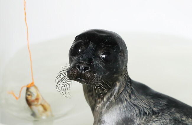 An orphaned common seal pup named 'Stellar' takes part in 'fish school' at Seal Rescue Ireland in Courtown, Co. Wexford PA