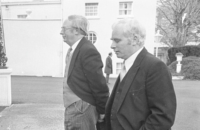 Ceann Comhairle Sean Treacy (right) and Chief Justice Tom O'Higgins arriving at Aras an Uachtarain for the reception for new President Cearbhall O Dalaigh in 1974. Getty Images