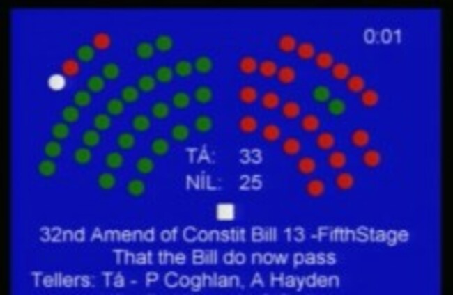 With a vote of 33 to 25 the Thirty-Second Amendment of the Constitution (Abolition of Seanad Éireann) Bill 2013 passed through the Seanad. A walk-through vote was held after the final electronic vote