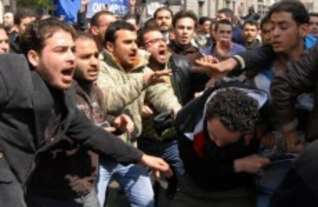Anti-goverment protesters clash with pro-government supporters (right) in Damascus on Friday after evening prayers. AP Photo/Muzaffar Salman)