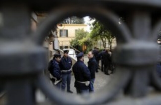 Police officers stand guard outside the Chilean embassy in Rome, the scene of a parcel bomb attack on 23 December, 2010. AP Photo/Andrew Medichini