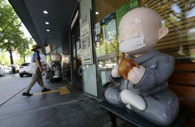 A Buddhist monk doll wearing a face mask is displayed near the Chogyesa temple in Seoul Ahn Young-joon/PA Images