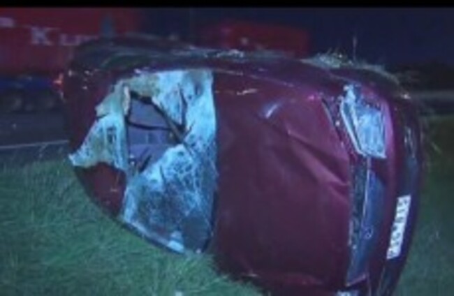 The damage to one car after sheep falling from a truck struck motorists below a bridge AP