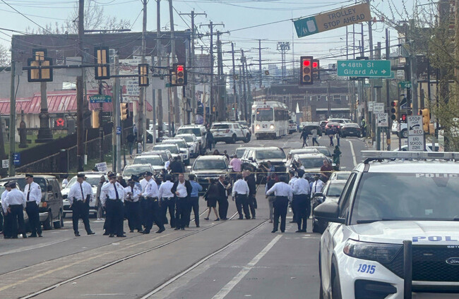 Police and officials gather on a cordoned off street at the scene of a shooting in Philadelphia Claudia Lauer/PA Images