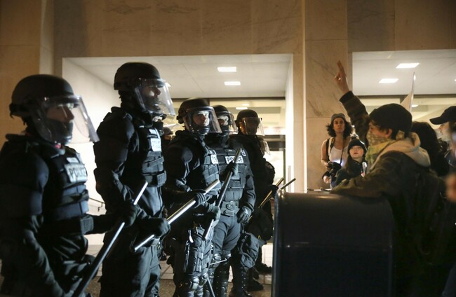 Police stand in front of people who march through downtown Portland. AP