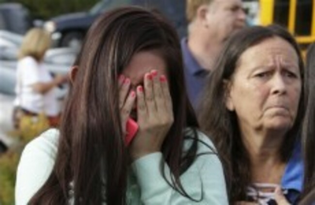 People react as they wait at a church, yesterday where students were taken to be reunited with parents following a shooting at Marysville Pilchuck High School AP