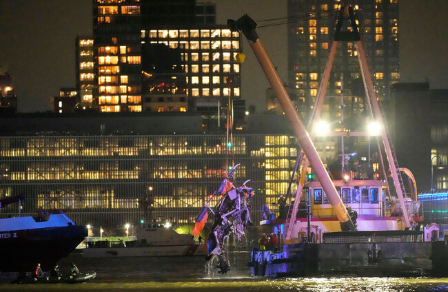 A crane vessel lifts the wreckage of a helicopter that crashed into the Hudson River. Alamy Stock Photo