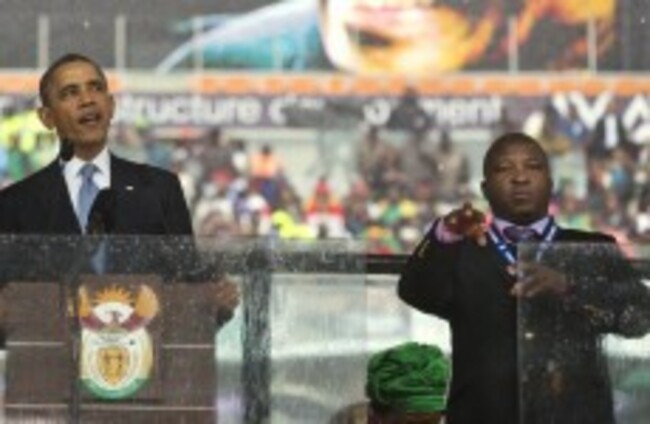 Thamsanqa Jantjie, right, interprets in sign language for President Barack Obama AP Photo/Evan Vucci, File