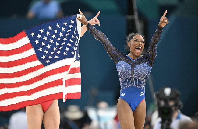 Biles, true to her mission to make gymnastics a safer and more inclusive sport, celebrated entirely with Lee by her side, each holding a corner of the same stripes-and-stars flag.
