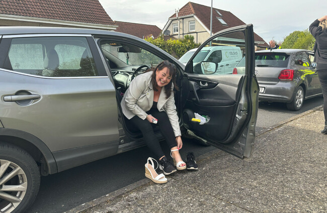Sinn Féin MP Michelle Gildernew with a change of footwear as she begins her canvas in Dundalk Diarmuid Pepper/The Journal