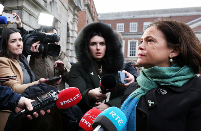 The Sinn Féin leader was heckled by a small group of protesters as she spoke to reporters in the courtyard of Dublin Castle. She moved the press event inside and continued to take questions there.