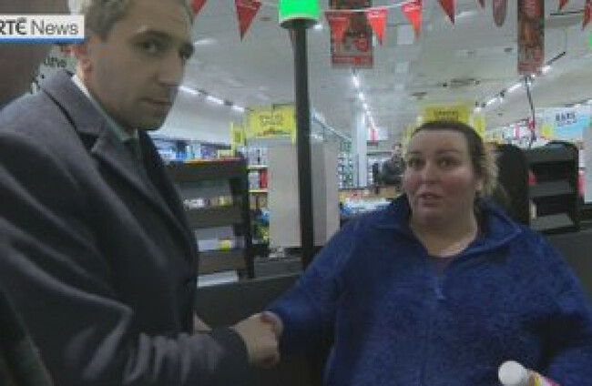 Taoiseach Simon Harris during encounter with Charlotte Fallon in Kanturk, Co Cork, during the election campaign. RTÉ