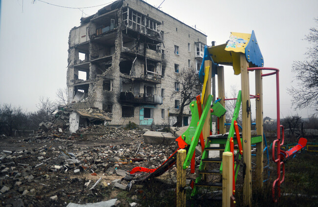 File photo of a children's playground against the background of buildings destroyed by Russian shelling in Izium, Ukraine. Alamy Stock Photo