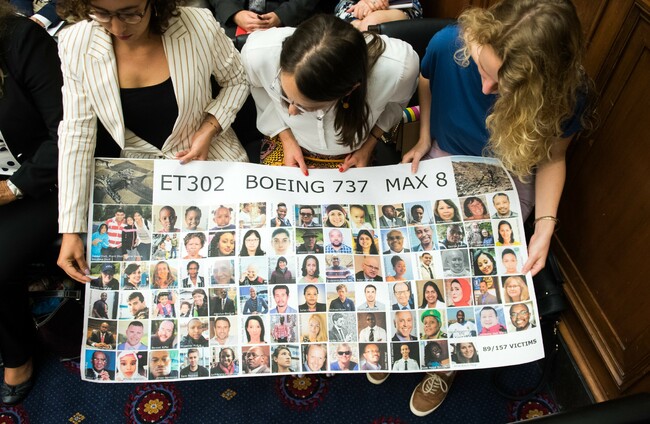 Hearing attendees hold a sign honoring the victims of the Ethiopian Airlines 302 crash during a House Transportation Subcommittee hearing on the Boeing 737 MAX on Capitol Hill in Washington, D.C. on June 19, 2019. UPI/PA Images