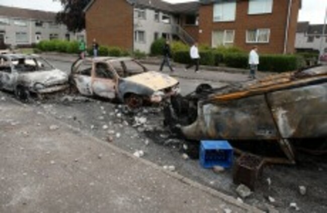 Cars lie burnt-out today in the aftermath of last night's riots in Ballyclare