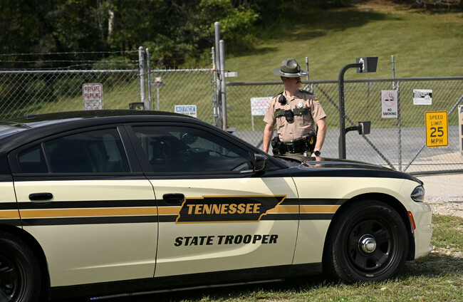 A Tennessee State trooper stands guard at the entrance to Accurate Energetic Systems, an explosives plant, after a blast resulted in multiple fatalities. Alamy Stock Photo