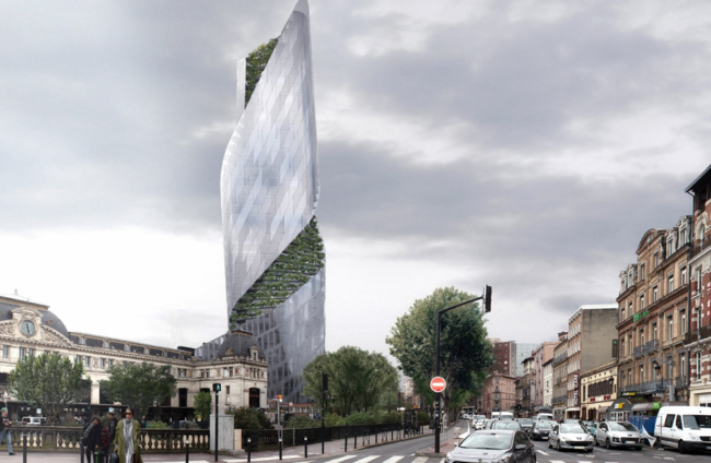 “Integrated into the overall form of the building, the façade and public platform is a continuous vertical landscape. This vertical green ribbon referenced the lush waterway of Canal du Midi that winds through the city. Trees will line the platform of the building and a ribbon of gardens will curl around the glass facade to its full height.