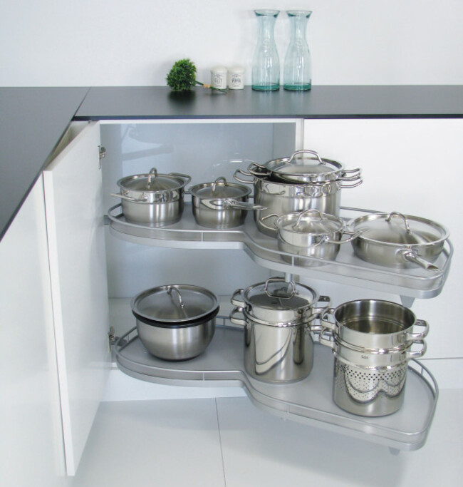 Something as simple as installing a carousel within the cabinet can revolutionise the space available. These can either spin within the cabinet, or pull out entirely. “The best would be something like the Le Mans corner carousel – they take what’s at the back and pull it right out into the floor space,” says Corey.