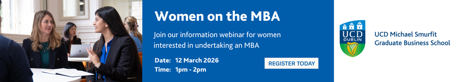 MBA applicants can undertake either the 1-year full-time MBA programme or the 2-year part-time Executive MBA. Support your career development and be prepared for the challenges of leadership in an ever changing world – register for the UCD Smurfit School Women on the MBA Webinar.