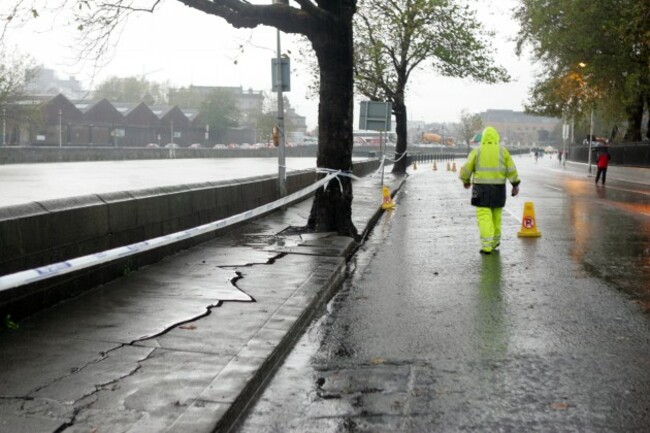 The massive cracks in the walls and pavement on Wolfe Tone Quay closed traffic down to one lane there even after water levels had subsided. This wasn’t the pressure of water from the river itself battering the wall, as one would expect. Instead, according to Tom Leahy of Dublin City Council when he spoke on Today with Pat Kenny on RTE Radio 1, it moved four inches over a 30-metre stretch as a result of the effect of such heavy rainfall on an old structure rather than a tidal problem. (Image: Photocall Ireland)