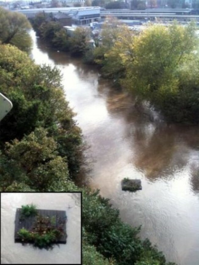 The new regulations don’t help those living in current developments on floodplains or areas prone to flooding. One wonders, for example, who ended up living so close to a river bank that their garden decking managed to be swept away down the Liffey this week, with pot plants still intact: (Image thanks to Alan Wall)