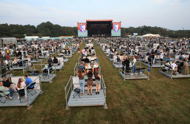 Fans at the Sam Fender concert at the Virgin Money Unity Arena, a pop-up venue in Gosforth Park, Newcastle, watched the outdoor concert in groups of up to five people from 500 separate raised metal platforms.