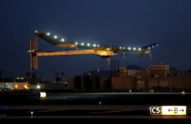 Solar Impulse, piloted by André Borschberg, takes flight during the second leg of its 2013 Across America mission from Harbor International Airport in Phoenix. AP Photo/Matt York, File