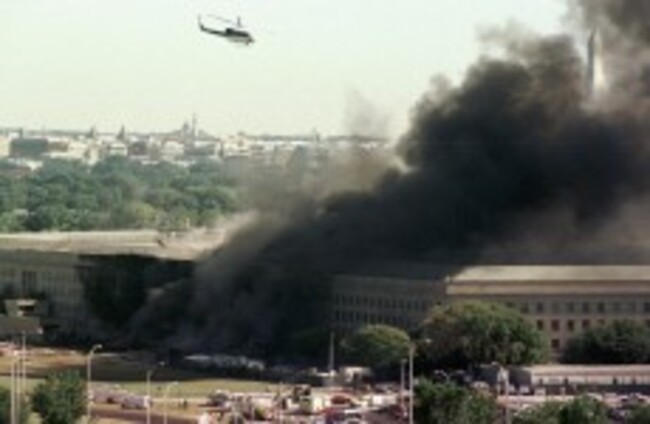 A helicopter flies over the burning Pentagon on 11 September 2001. TOM HORAN/AP/Press Association Images