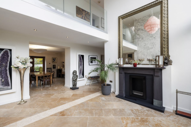 As you step through the pedestrian gate off Eglinton Road, a pathway of natural stone welcomes you into the front garden. The first glimpse of the home reveals a striking, double-height glass facade with folding doors. This dramatic entrance opens up to a foyer featuring an eye-catching chandelier, a mezzanine with a glass balcony and the warmth of a biofuel fireplace. The atmosphere is both grand and intimate, combining natural materials like limestone flooring and woodland-inspired wallpaper.
