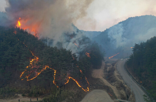 Images from Uljin and Samcheok showed large swathes of white and grey smoke emerging from the slopes of mountains that cover the country’s eastern coast, and firefighters operating water hoses amid thick, smoky air.