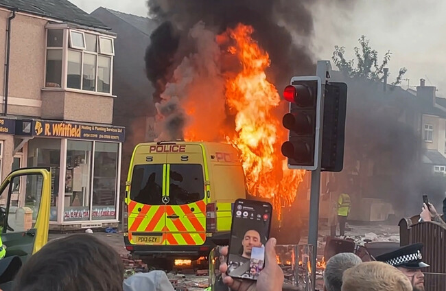 A police van set alight as trouble flares during a protest in Southport, UK PA