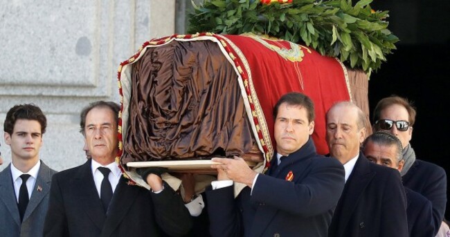 The coffin was carried by eight family members and placed into a hearse and driven to a helicopter where it was to be transferred to a grave just north of Madrid.