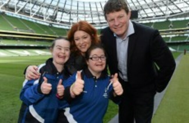 RTÉ presenter Blathnaid Ni Chofaigh and former Irish and Leinster player Malcolm O'Kelly with Orla Kearns and Kim O'Kelly from Naas at the launch of Leinster's Special Olympics team in May. Facebook/Matt Browne/SPORTSFILE