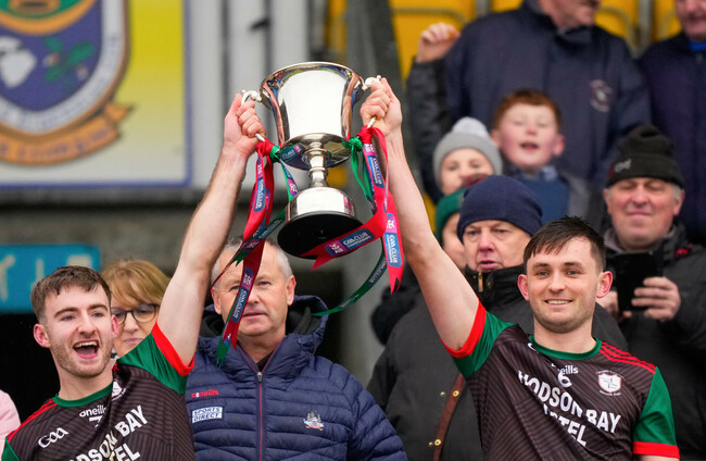 Paul McGrath and Brian Stick lift the trophy. James Lawlor/INPHO