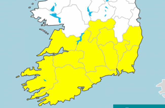 The warning is for Munster, Carlow, Kilkenny, Laois, Wexford, Wicklow and Offaly.