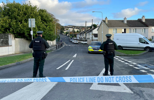 Officers from the PSNI at the scene, following the attempted murder of two officers in Strabane. PA